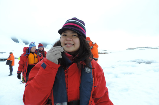這天登陸過後,等待登上橡皮艇返回考察船上時,探險隊員摘了一條懸掛在岸邊,晶瑩剔透的冰柱,並放進嘴裡津津有味的吃起來,更笑稱這是南極的零食,他們又慷慨地多摘幾條遞給我們嚐嚐。冰柱由岸上冰川融化而成,雖然是淡水冰,惟因摘自沿海岸邊,依稀能嚐到淡淡的海洋餘韻。